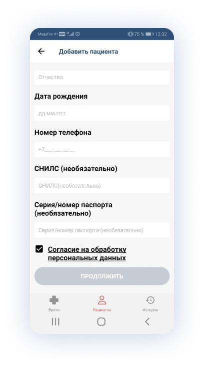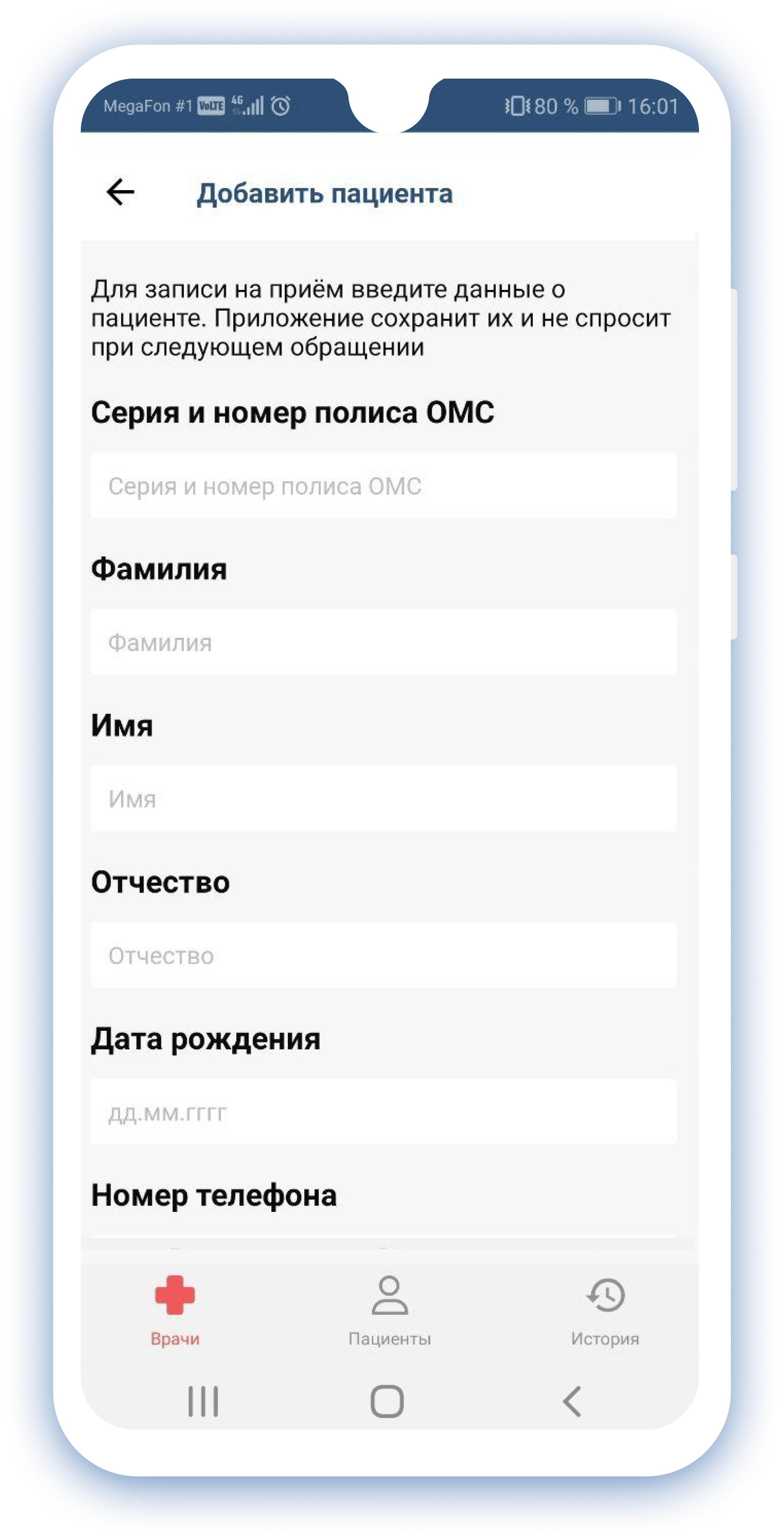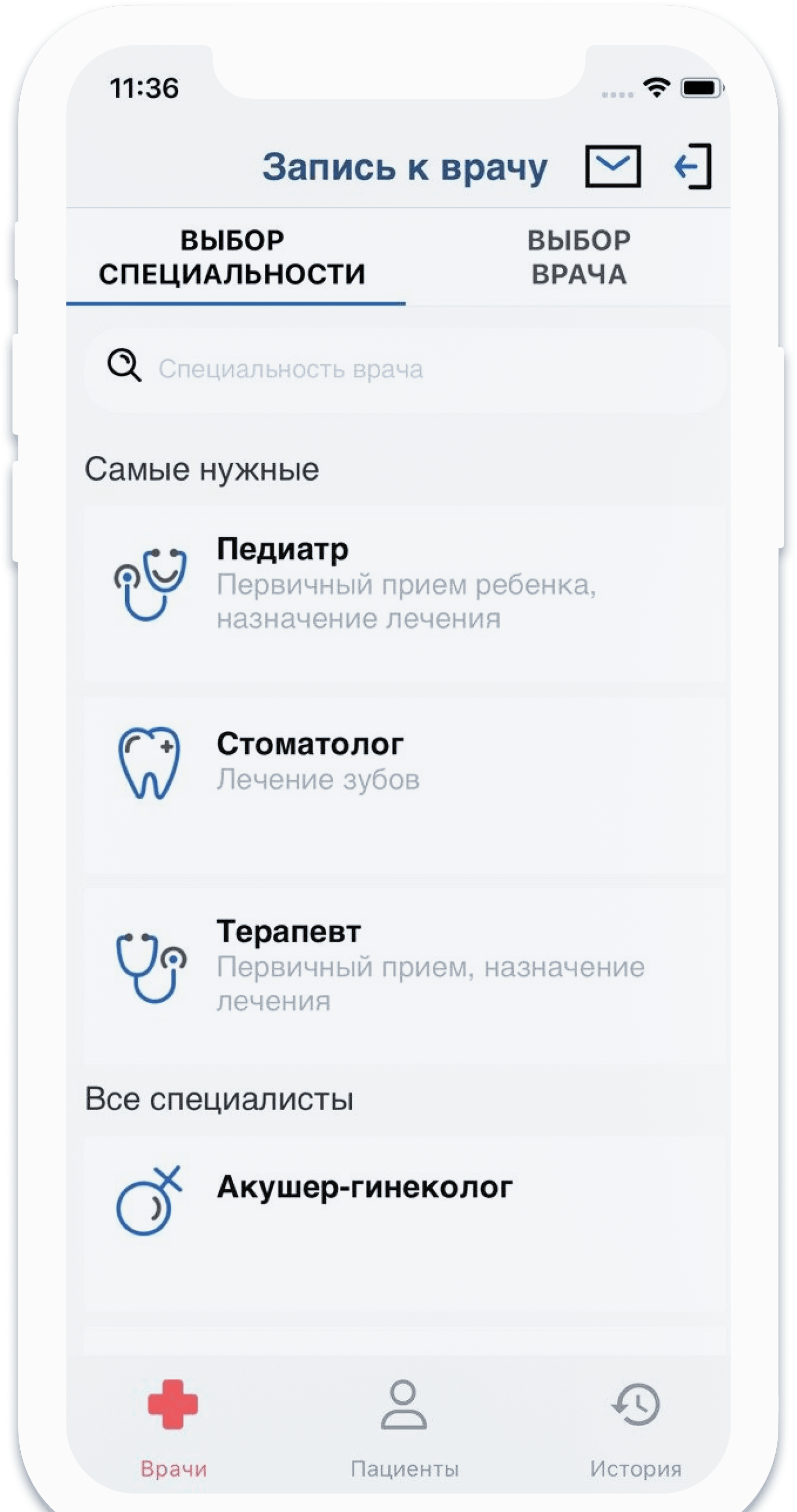 При первом запуске приложения выберите свой город. При необходимости вы можете изменить город после выбора специальности врача на экране со списком больниц.